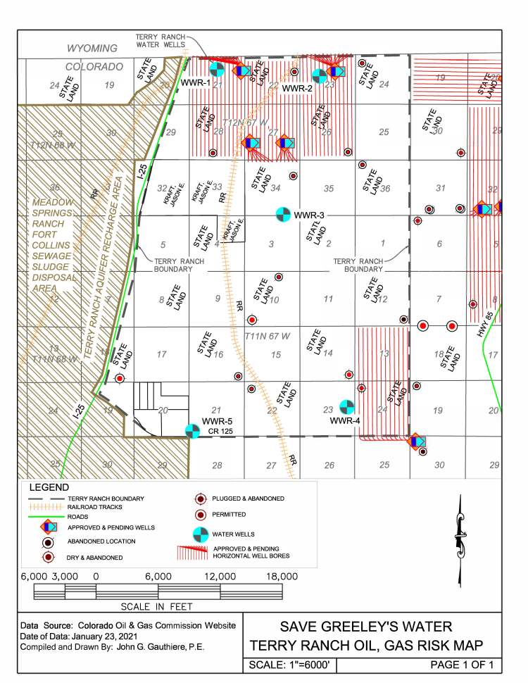 This map is intended to give a sense of the potential aquifer contamination sources in the vicinity of the Terry Ranch aquifer. The potential for groundwater contamination is directly related to the intensity and type of land use above the aquifer or in the aquifer’s off-site recharge areas or upstream drainage areas such as the Meadow Spring Ranch or in Wyoming. Some of the potential aquifer contamination sources would include spills or leaks from oil, gas and mining operations, railway accidents and highway (I-25) accidents. The area contains many abandoned oil and gas well sites as well as approved and pending well sites which will be drilled in the future. Note the intensity of approved and pending horizontal well bores. Also note the Meadow Springs Ranch which is part of the recharge area for the Terry Ranch aquifer. The Meadow Springs Ranch is owned and utilized by the City of Fort Collins for disposal of their municipal sewage sludge.